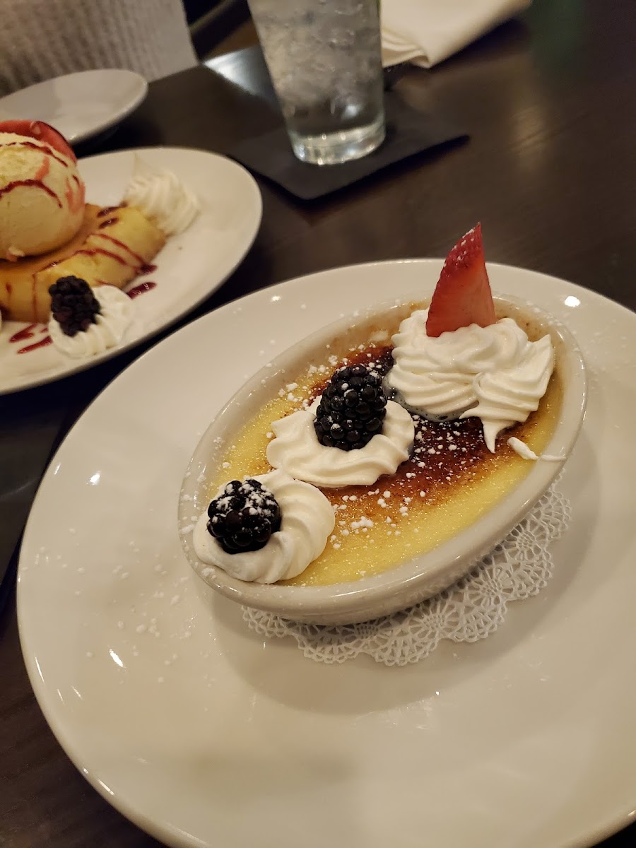 We have come here and always have eaten outside aside from one time we had drinks and appetizers at the bar. Last night was our 27th wedding anniversary and my husband booked reservations for patio seating. If you ever have a chance to go, and it is a beautiful day, definitely request the patio and I would suggest making reservations ahead of time because it got very busy last night. The outdoor area is stunning. They have huge umbrellas for shade, an absolutely gorgeous garden filled with flowers and a little waterfall. There is an outdoor bar with a big screen tv, so my husband got to watch the hockey playoffs last night. The ambience is 100%....gorgeous! Now for the food ! We have some appetizers we always order and they never disappoint! Baked Spinach & Artichoke dip served with Crostini bread ....delicious. We also always order the Shrimp & Crab Campechana, which is loaded with shrimp, crab and avocado, fantastic! My husband ordered an incredible steak served with street corn on the cob, and I had the pan seared scallops. Both meals were excellent! Being that it was our anniversary they had a little card on our table and we received not just the one, but two comped desserts. The dessert tray was exceptional, with so many choices! I went off of my regular choices last night to try the bread pudding while my husband had caramel cheesecake.... Both were delicious! The owners are very friendly and they jumped right in to helping and talking to people! They each stopped by a few times to make sure we were enjoying our dinner and even took some pictures for us by the garden before we left. This is an incredible restaurant with a touch of paradise! Although we have never eaten in the inside dining room, it looks beautiful. I would highly recommend coming here. When we got home, it was like returning from paradise.... A perfect way to spend our anniversary dinner.